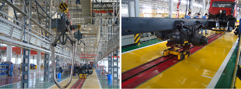 該項目由總裝配線和車身分裝線組成。總裝配線用于整車底盤裝配及檢查下線,它由兩部分組成,前部分采用單鏈牽引小車形式,即可調(diào)臺車間距垂直返回式地拖鏈,后部分采用雙板鏈形式。總裝線產(chǎn)品上線為起吊設(shè)備吊裝上線,產(chǎn)品下線為駕駛員駕駛產(chǎn)品下線。產(chǎn)品在總裝配線上由兩臺至四臺臺車支撐運行,完成駕駛室、輪胎、車廂等的裝配作業(yè)。為了使產(chǎn)品在雙行道板鏈和地拖鏈之間自動平滑過渡,在地拖鏈的末端與雙行道板鏈重疊段設(shè)置向下的緩坡。