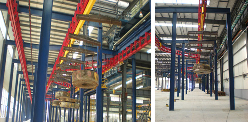該輸送系統(tǒng)用于塔機結(jié)構(gòu)件的涂裝生產(chǎn)線,承擔涂裝工件的輸送,是全天候作業(yè)的工作場所。輸送的主要構(gòu)件有:塔身、塔頂、標準節(jié)、平衡臂、起重臂。工件外形尺寸:結(jié)構(gòu)件12000×2800×2800mm;重量:單掛6000kg、雙掛12000kg;生產(chǎn)綱領:兩班制,年產(chǎn)3000臺套。系統(tǒng)采用公司新開發(fā)的重型積放式懸掛輸送機,該機具有載重量大,工作效率高等特點。