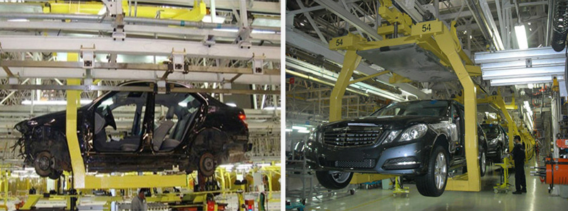 本項(xiàng)目是在北京奔馳現(xiàn)有的克萊斯勒汽車總裝車間整合設(shè)備,生產(chǎn)奔馳E級(jí)車和C級(jí)車。在地面高度新安裝ASD輸送線。使用空滑撬升降機(jī)將車身降到地面高度。空滑撬送入滾床,在0m時(shí),通過(guò)鏈?zhǔn)揭菩袡C(jī)輸送到北側(cè)新的ASD輸送線。再通過(guò)移行機(jī)、滾床和升降機(jī),把車身送入+3.3米的C型吊具中。車身在總裝滑撬上,完成操作后,車身向左或向右進(jìn)入橫移保護(hù)工位(速度12min/min)。為了適應(yīng)兩種車型的自動(dòng)轉(zhuǎn)換。在線安裝支點(diǎn)自動(dòng)轉(zhuǎn)換裝置,按照不同車型進(jìn)行轉(zhuǎn)換。在底盤吊具和橇體上車身轉(zhuǎn)掛工位,設(shè)置舉升臺(tái)和浮動(dòng)裝置,并經(jīng)定位裝置進(jìn)行準(zhǔn)確定位,保證轉(zhuǎn)掛的準(zhǔn)確性。車門線為了適應(yīng)新車型,對(duì)所有支撐和安裝結(jié)構(gòu)進(jìn)行改造更新,保證車門線適應(yīng)新車型的需要。