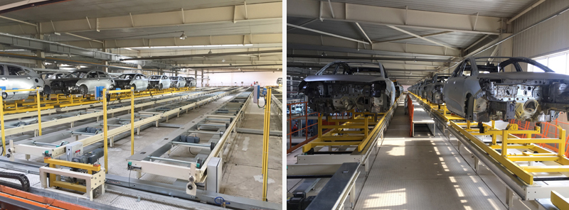 晉中吉利焊裝滑撬輸送線包括:包括焊裝至涂裝工廠帶式滾床輸送設備(WBS)、焊裝調整線(板式輸送鏈)等。主要設備有升降機、堆垛拆垛、叉式移載等。輸送線配置有CS控制系統,AVI信息系統,實現實時監控現場設備、車身調度、故障報警等功能。
