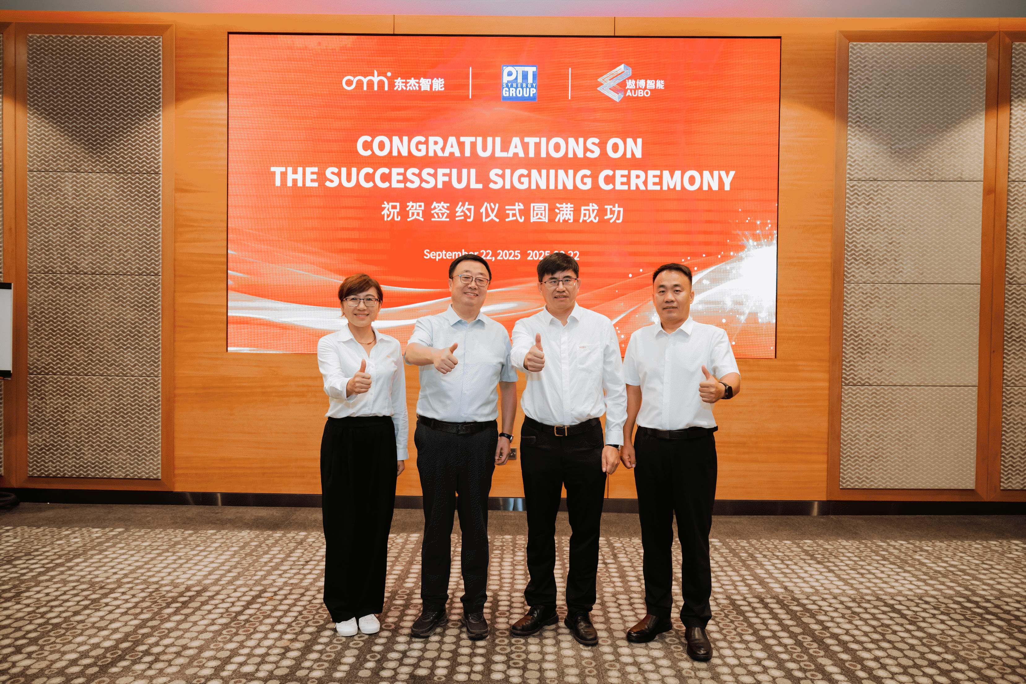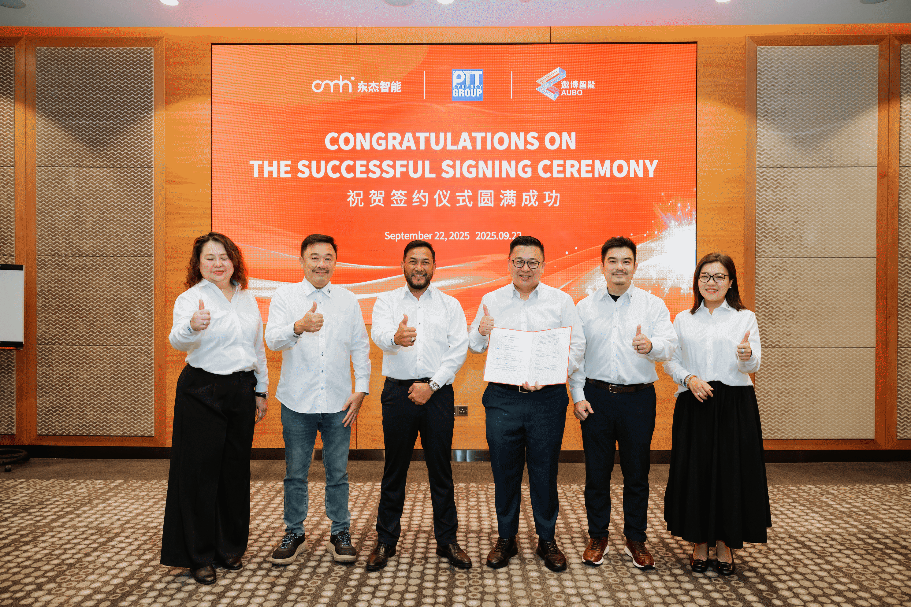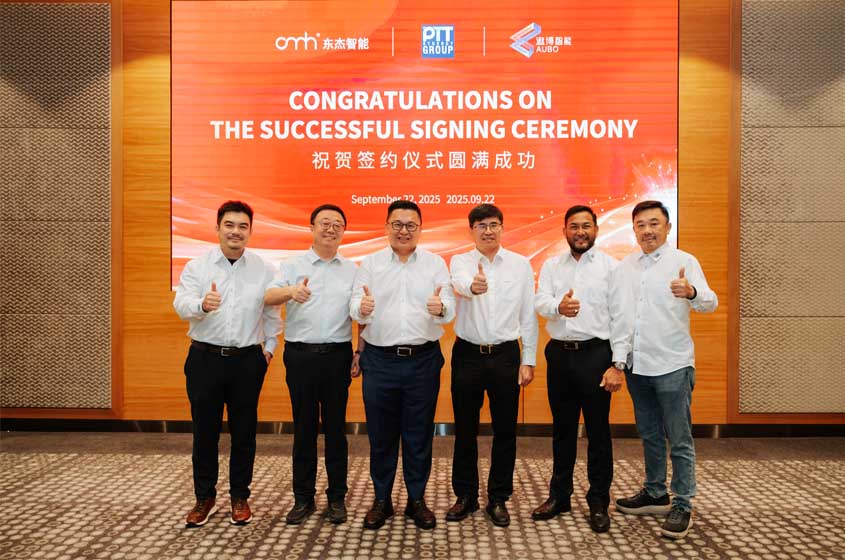 在各方見證下,東杰智能董事長韓永光、遨博智能董事長魏洪興與PTT集團董事總經理Teo Swee Phin共同簽署協議。